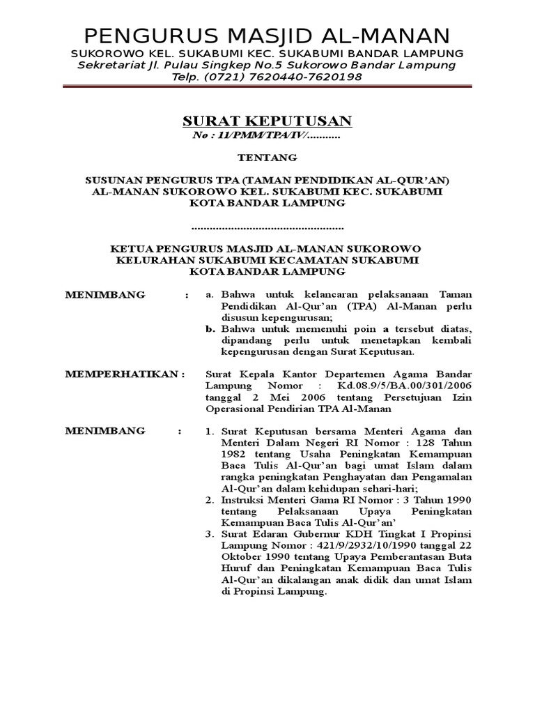 Abdul malik (mta cabang depok) sekretaris 1 : Contoh sk pengurus masjiddeskripsi lengkap. Download contoh sk pengurus tpa. Berkaitan dengan peraturan yang terkait setiap sekolah wajib mengelola barang atau asset daerah yang masih ada dengan kriteria baik, rusak ringan dan rusak berat. Pengangkatan jabatan kepala taman pendidikan al quran.